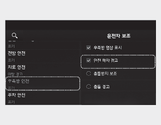 시동 「ON」 상태에서 설정 메뉴의 「운전자 보조 → 후측방 안전 → 안전 하차 경고」를 선택하면 기능이 켜집니다. 기능을 끄고 싶으면 선택을 해제해야 합니다.