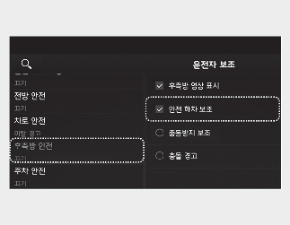 시동 「ON」 상태에서 설정 메뉴의 「운전자 보조 → 후측방 안전 → 안전 하차 보조」를 선택하면 기능이 켜집니다. 기능을 끄고 싶으면 선택을 해제해야 합니다.