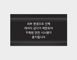 인식 센서 경고 메시지가 표시되지 않거나 경고등이 켜지지 않더라도 후측방 안전 시스템이 정상 작동하지 않을 수 있습니다.