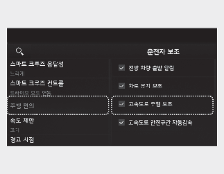 시동 「ON」 상태에서 설정 메뉴의 「운전자 보조 → 주행 편의」에서 세부 설정을 통해 각 기능의 사용 여부를 선택하실 수 있습니다.