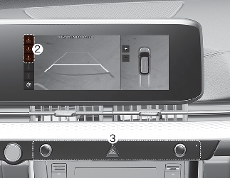 인포테인먼트 시스템의 버튼 (3)을 눌러 「R」(후진)단 외 서라운드 뷰 모니터를 해제할 수 있습니다.