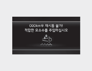 」과 함께 " 요소수가 고갈되어 재시동이 불가합니다" 경고 메시지가 표시되며, 신속히 요소수를 보충하십시오. 요소수 보충없이 주행하면 요소수 부족으로 재시동 시 시동이 걸리지 않을 수 있습니다. 주행 습관 및 도로 환경