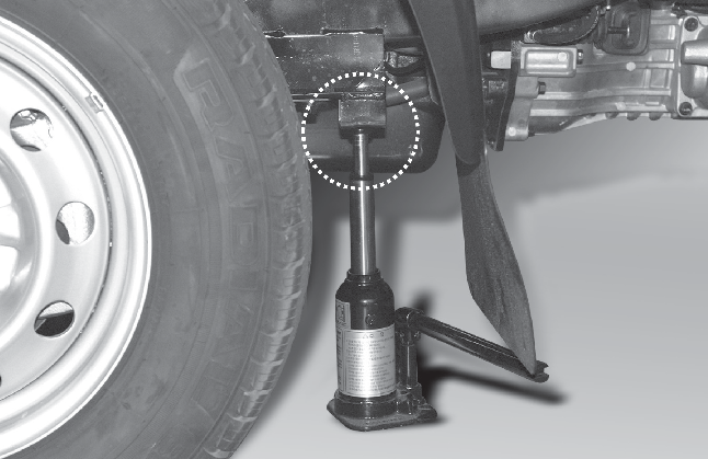 Coloque o macaco à frente ou atrás da posição do macaco, o mais perto possível do pneu que pretende trocar. Coloque o macaco como indicado na imagem.