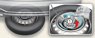 Gdy koło dotknie ziemi, przekręcać klucz dalej w tym samym kierunku, aby wyciągnąć koło zapasowe na zewnątrz. Nigdy nie przekręcać klucza nadmiernie, gdyż może to spowodować uszkodzenie podnośnika koła zapasowego.