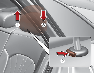 To lower the headrest, push and hold the release button (2) on the headrest support and lower the headrest to the desired position (3).