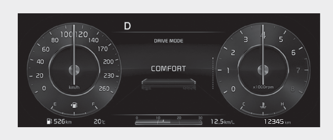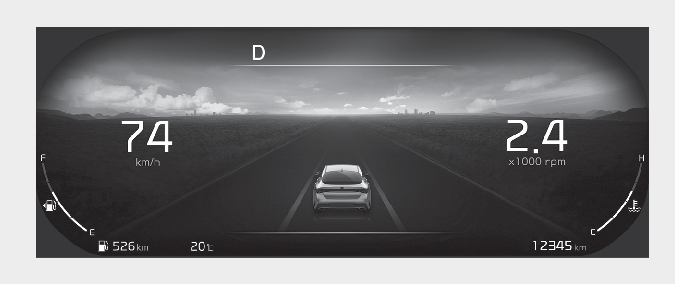Theme A is the basic theme of the full LCD type cluster and provides different graphic styles depending on drive mode.