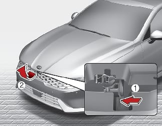 Go to the front of the vehicle, raise the hood slightly, push the secondary latch (1) up side and lift the hood (2).