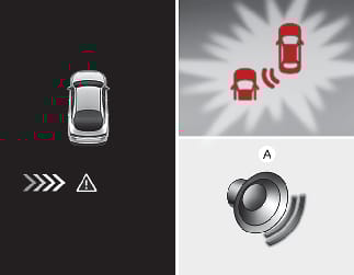 If the vehicle detected by the sensors approaches from the rear left/right side of your vehicle, the warning chime will sound, the warning light on the outside rear view mirror will blink and a message will appear on the LCD display. If the rear view monitor system is in activation, a message will also appear on the infotainment system screen.