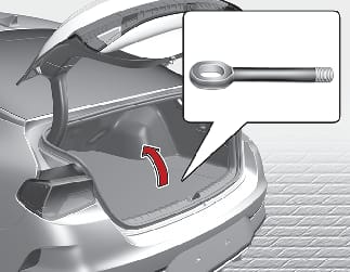 Install the towing hook by turning it clockwise into the hole until it is fully secured.