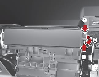 Push in both sides of the glove box as shown. This will ensure that the glove box stopper pins will get released from its