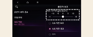 속도 제한 보조 및 경고 기능은 제한속도에 오프셋이 더해진 값을 기준으로 작동합니다. 인식된 제한속도에 맞춰 속도를 변경하거나 경고하도록 하려면 오프셋 값을 '0'으로 설정하십시오.
