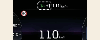 수동 속도 제한 보조 또는 스마트 크루즈 컨트롤이 작동하는 중에 도로의 제한속도가 변경되면 위 또는 아래 방향의 화살표를 통해 설정속도 변경이 필요함을 알립니다. (+) 또는 (-) 스위치를 눌러 제한속도에 맞게 설정속도를 변경할 수 있습니다.