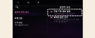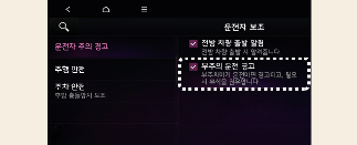 시동 'ON' 상태에서 계기판의 ‘사용자 설정 → 운전자 보조 → 운전자 주의 경고’ 또는 인포테인먼트 시스템의 ‘설정 → 차량 → 운전자 보조 → 운전자 주의 경고’를 차례로 선택하십시오. 각 기능의 사용 여부를 설정할 수 있습니다.