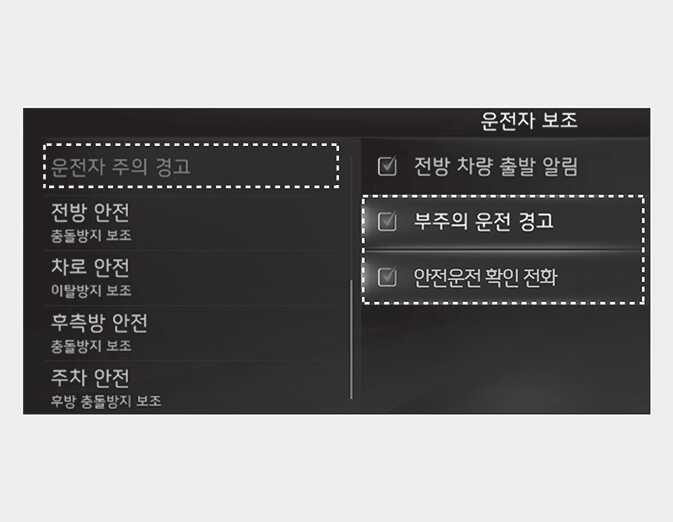 시동 「ON」 상태에서 인포테인먼트 시스템 ‘설정 → 차량 → 운전자 보조 → 운전자 주의 경고’ 하위 메뉴에서 ‘전방 차량 출발 알림/부주의 운전 경고/안전운전 확인 전화’ 메뉴를 통해 설정할 수 있습니다.