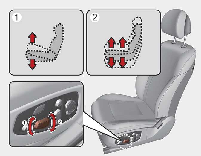 높낮이 조절 스위치의 앞쪽(1)을 올리거나 내리면 좌석의 앞부분이 올라가거나 내려오고, 뒤쪽(2)을 올리거나 내리면 좌석 전체가 올라가거나 내려옵니다.