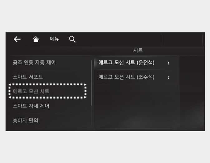 인포테인먼트 시스템의 '설정 → 차량 → 시트 → 에르고 모션 시트'를 차례로 선택하십시오. 운전자를 위한 보조 기능을 선택하거나 설정할 수 있습니다.