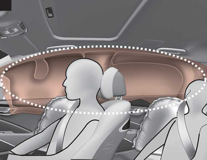 커튼 에어백은 양쪽 도어 위쪽의 천장 끝에 내장되어 있습니다. 커튼 에어백은 작동 조건이 충족되면 앞좌석과 뒷좌석 도어 쪽 탑승자의 머리를 보호하기 위하여 작동됩니다.