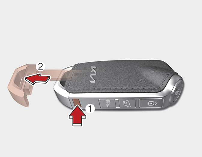 키 고정 버튼(1)을 누른 상태에서 비상 키(2)를 잡아당겨 분리하십시오.