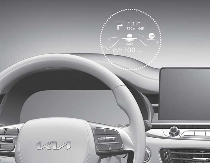 운전자 전면 유리창에 클러스터 및 내비게이션의 주요정보를 표시하여 운전자의 시선을 분산시키지 않고 정보를 제공하는 편의 장치입니다.