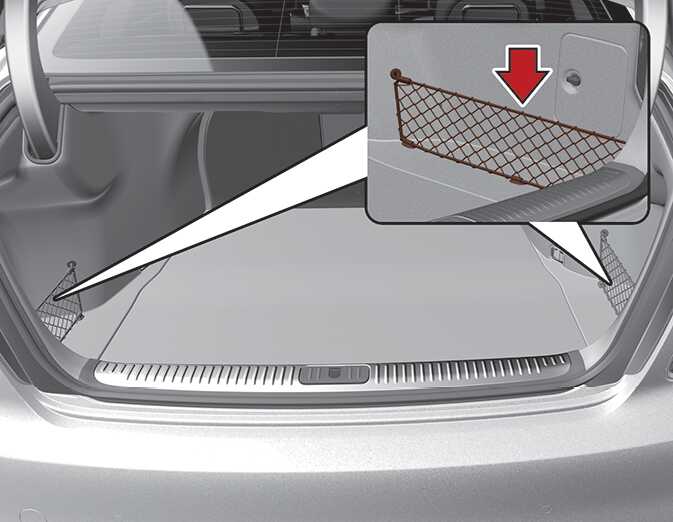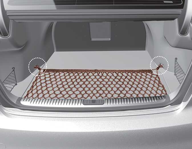 전체 그물망 그림 1. 전체 그물망 ORJ041052 그림 2. 사이드 그물망 ORJ041053 화물 적재 공간에 물건을 싣고 운전할 때, 고리에 그물망을 설치하여 화물이 트렁크에 손상을 주거나 흘러내리는 것을 방지할 수 있습니다.
