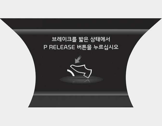 브레이크를 밟은 상태에서 P RELEASE 버튼을 누르십시오 ORJ041480 「N」(중립)단 주차를 할 때 브레이크를 밟지 않고 「P RELEASE」 버튼을 눌렀을 때 표시창에 경고문이 표시됩니다. 브레이크를 밟고 「P RELEASE」 버튼을 누르십시오.