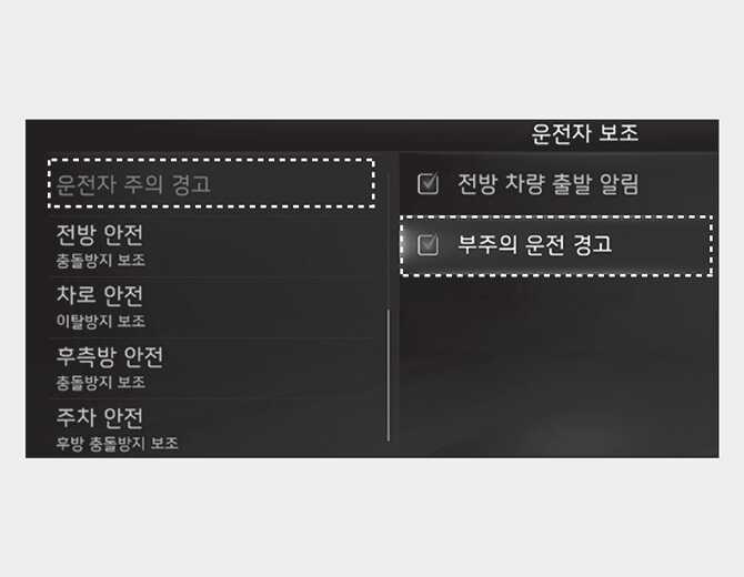 시동 ‘ON’ 상태에서 인포테인먼트 시스템의 설정 → 차량 → 운전자 보조 → 운전자 주의 경고를 차례로 선택하십시오. 각 기능의 사용 여부를 설정할 수 있습니다.