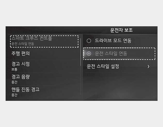 운전 스타일 연동을 지원하는 경우에만 인포테인먼트 시스템의 설정 → 차량 → 운전자 보조 → 스마트 크루즈 컨트롤 메뉴에서 드라이브 모드 연동 또는 운전 스타일 연동을 선택할 수 있습니다.