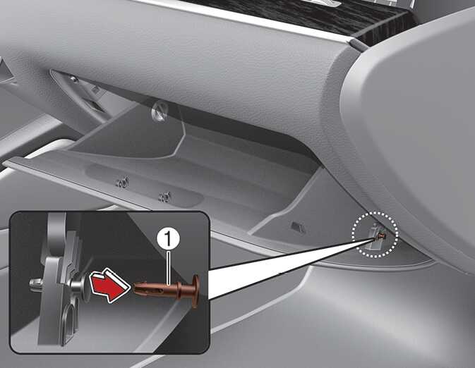 글로브박스를 열고 오른쪽 옆면의 지지대에서 핀(1)을 분리하십시오.