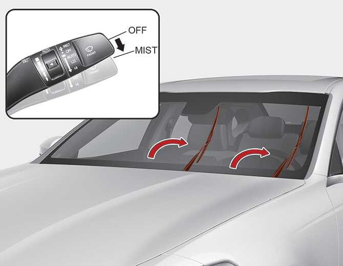엔진 시동을 끈 후 20초 이내에 와이퍼가 최상단으로 올라 갈 때까지 와이퍼 스위치를 2초 이상 「MIST」위치로 내리십시오.