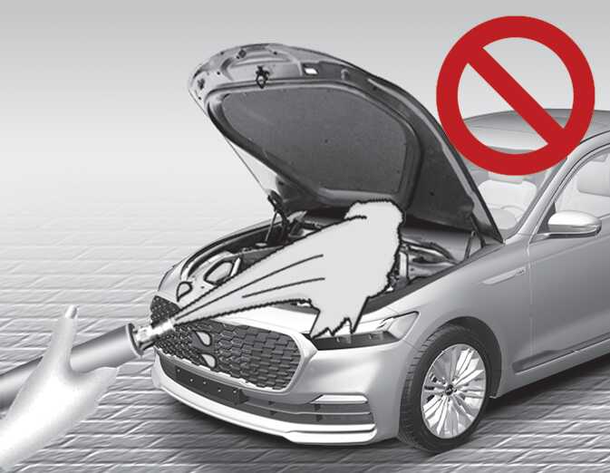 엔진룸 내부를 물로 닦으면(또는 고압 세차) 엔진룸 내부의 전기회로 또는 에어덕트로 물이 유입되어 정상적인 차량 운행이 불가능할 수 있습니다.