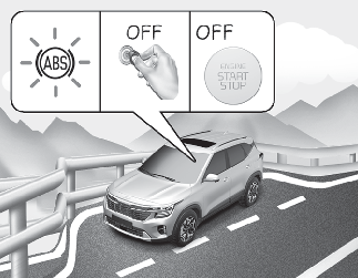 경고등이 꺼지지 않거나 주행 후 다시 경고등이 켜지면 ABS 장치의 고장이므로 자사 직영 서비스센터 또는 서비스협력사에서 점검 및 정비를 받으십시오.