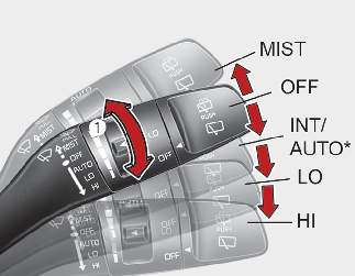 INT: 와이퍼가 일정한 간격을 두고 간헐적으로 작동합니다. 비의 양이 비교적 적을 때 사용하십시오.