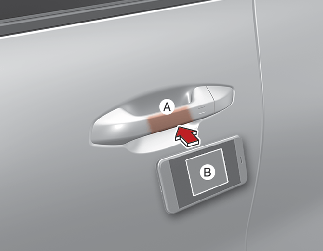 NFC 안테나가 있는 스마트폰의 뒷면을 운전석 또는 동승석 도어 손잡이 인증 패드(A)에 약 2초 이상 대십시오.