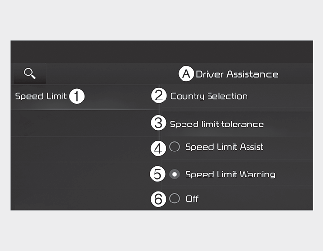 Select country: If the vehicle is not equipped with navigation system, a settings menu will be provided to select the country manually. For Intelligent Speed Limit Assist to operate properly, select the country where the vehicle is currently being driven.