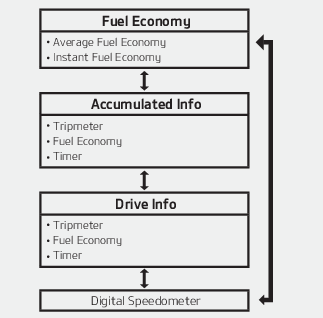 This display shows the trip distance, the average fuel efficiency, and the total driving time information once per one ignition cycle.