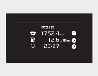 Het display toont de ritafstand (1), het gemiddelde brandstofverbruik (2) en de totale rijtijd (3) voor iedere cyclus tussen het in- en uitschakelen van de motor.