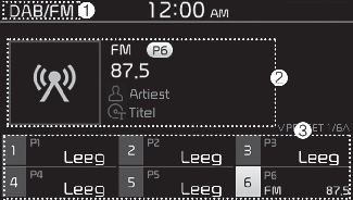 • Scan (Scannen): Het systeem zoekt naar radiozenders met een sterk radiosignaal en laat elke radiozender vijf seconden horen.
