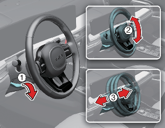 Stellen Sie den Lenkradwinkel (2) und die Position (3) mit dem Schalter (1) ein.