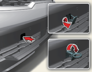 Bauen Sie die Abschleppöse an, indem Sie sie im Uhrzeigersinn soweit in die Öffnung drehen, dass sie vollständig festgezogen ist.