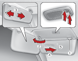 Чтобы воспользоваться зеркальцем, опустите солнцезащитный козырек вниз и откройте крышку (4).