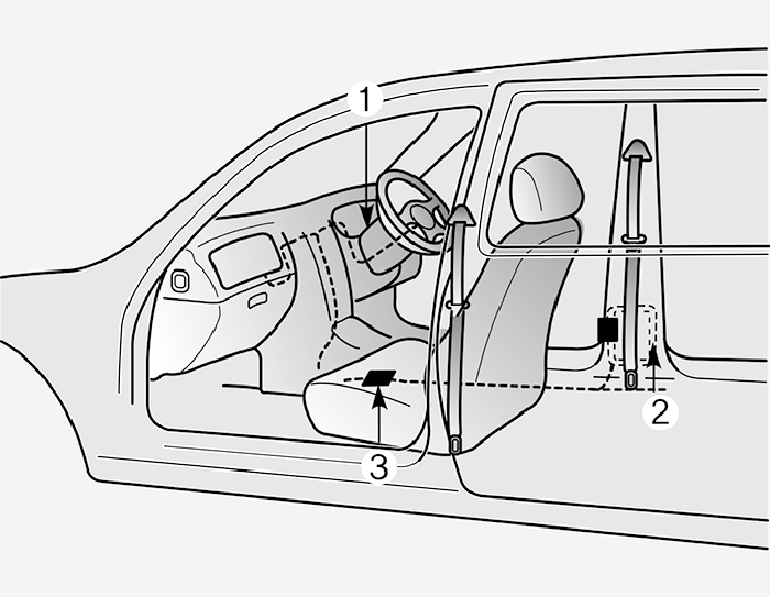 The seat belt pre-tensioner system consists mainly of the following components. Their locations are shown in the illustration: