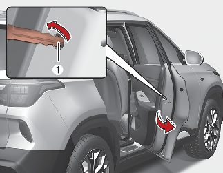 The child safety lock is located on the edge of each rear door. When the child safety lock is in the lock position (1), the rear door will not open if the inner door handle is pulled.