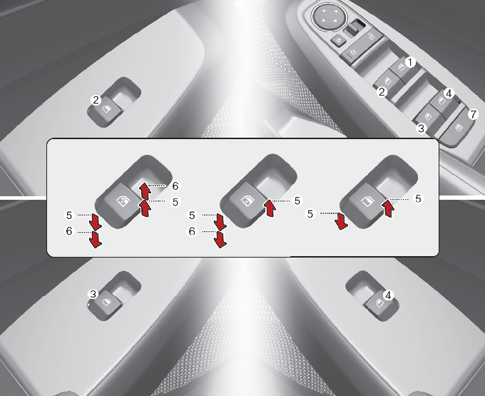 Each door has a power window switch that controls the door's window. The driver has a power window lock button which can block the operation of rear passenger windows. The power windows can be operated for approximately 10 minutes after the ignition key is removed or turned to the ACC or LOCK position. However, if the front doors are opened, the power windows cannot be operated even within the 10 minutes period.