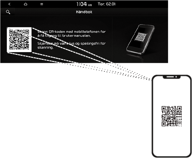 Scanner QR-kode: Trykk på [SETUP] > [Generelt] > [Systeminfo] > [Brukerhåndbok]. Scan QR-koden og trykk på varslingen for å gå til nettsiden.