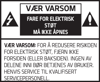 For å redusere risikoen for elektrisk støt, må du ikke fjerne forsiden eller baksiden på dette produktet. Det er ingen deler inni som brukeren selv kan utføre service på. La kvalifisert servicepersonell utføre all service.