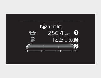 Dersom den beregnede kjøredistansen er under 1 km, vil kjøredistanse til drivstofftanken er tom vises som "---".