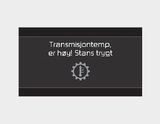 Når clutchen overopphetes, vil sikker beskyttelsesmodus tre i kraft, girposisjonsindikatoren på instrumentpanelet blinker og du hører en varsellyd. Da vil varselmeldingen "Transmission temp. is high! Stop safely" (Transmisjontemp.er høy! Stans trygt) vises på LCD-displayet, og det kan hende at kjøringen blir ujevn.