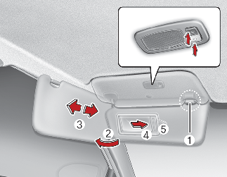 Per usare lo specchietto di cortesia, tirare giù l'aletta parasole e far scorrere il coperchio specchietto (4).