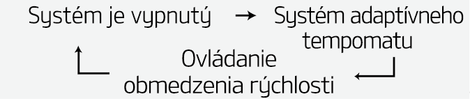 Každá z týchto akcií zruší činnosť adaptívneho tempomatu. (nastavená rýchlosť a vzdialenosť medzi vozidlami na LCD displeji zhasnú.)