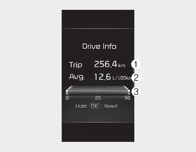 This display shows the trip distance (1), the average fuel efficiency (2), and the instant fuel economy (3) information once per one ignition cycle.